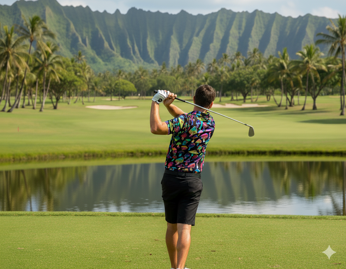 White Daisys on Black Hawaiian Floral Golf Shirt.